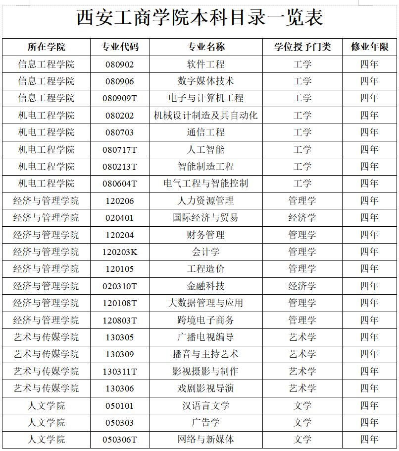 西安工商学院合理布局学科设置,优化专业结构,形成了以管理学、工学为主,管、工、经、艺、文相互支撑、协调发展的学科专业布局。现有本科专业23个,分属5大学科门类,其中包括2个经济学专业、6个管理学专业、3个文学专业、4个艺术学专业和8个工学专业。其中软件工程专业为国家级一流本科专业,财务管理、汉语言文学、机械设计制造及其自动化专业为陕西省一流本科专业。