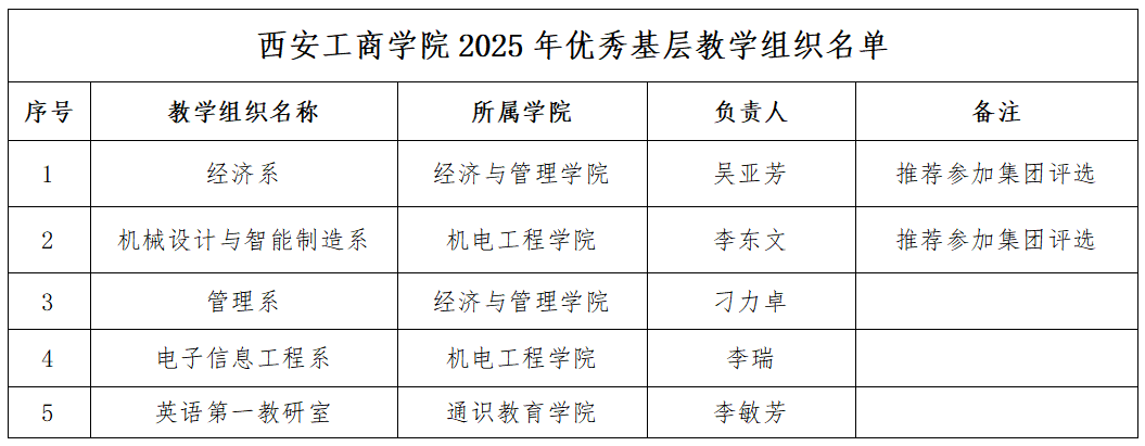 根据《关于开展西安工商学院优秀基层教学组织推荐评选工作的通知》(教务发【2025】167号)文件要求,学校组织开展了优秀基层教学组织评选工作,经学院推荐、材料审核、学校组织专家评审,评审出5个校级优秀基层教学组织,同时择优推荐前2个参加第二届集团优秀基层教学组织评选活动,现将评审结果进行公示(详见下图)。