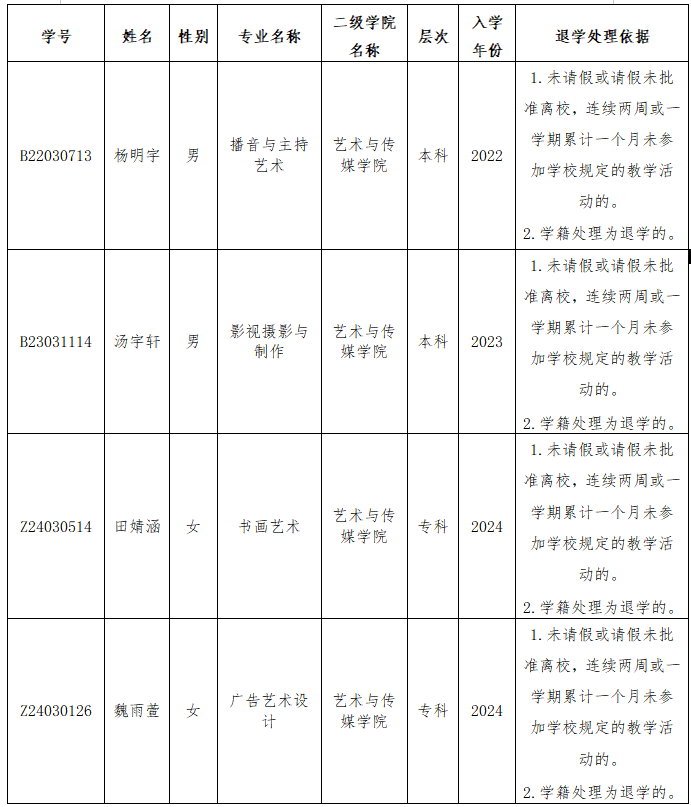 根据《普通高等学校学生管理规定》(教育部令第41号)、《西安工商学院本科学生学籍管理规定》(校教发[2025]41号)和《西安工商学院高职(专科)学生学籍管理规定》(校教发[2025]40号)相关规定,经西安工商学院校务会研究,决定给予杨明宇等4名同学退学处理。现予以公示,具体信息如下: